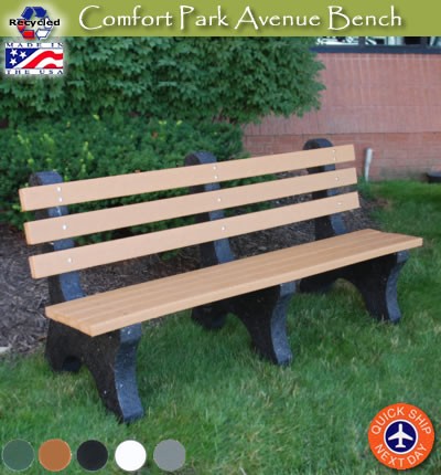The Comfort Park Avenue Bench features a high back and is definitely a comfortable bench for any commercial location. You will love the classic, sleek park bench look and unless we told you, you may not even realize it is made from recycled plastic material. Commercial grade outdoor furniture that will easily complement your home. The Jayhawks Plastics Comfort Park Avenue Bench is available in five poly colors. Virtually maintenance free, this outdoor park bench is fastened with heavy duty, zinc coated hardware. Leave it out all year round.